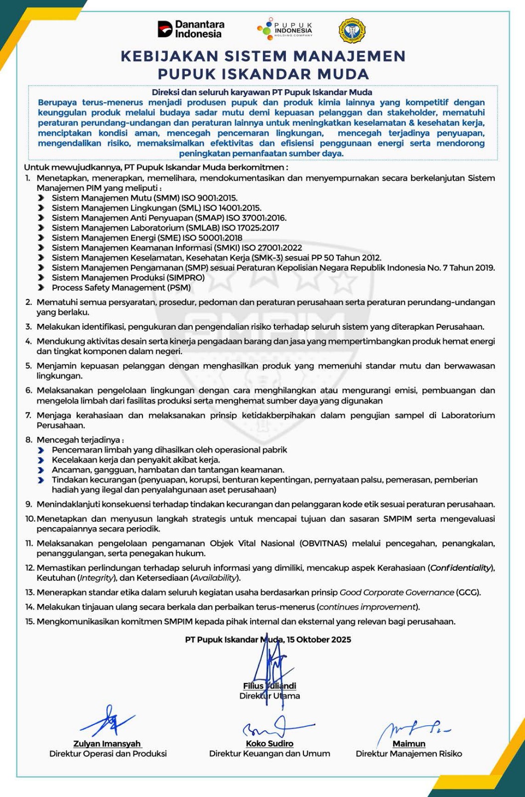 PT Pupuk Iskandar Muda merumuskan Kebijakan Keberlanjutan yang telah disahkan oleh Direktur Utama. Kebijakan ini menjadi panduan untuk menjamin kepatuhan terhadap peraturan yang berlaku, sekaligus mendorong penciptaan nilai jangka panjang bagi para pemangku kepentingan melalui penerapan praktik bisnis berkelanjutan. Kebijakan Keberlanjutan ini merupakan wujud komitmen PT Pupuk Iskandar Muda dalam menangani isu keberlanjutan dan perubahan iklim di Perusahaan. Kebijakan ini mencakup aspek Environmental, Social, Governance (ESG). Dalam implementasinya kebijakan keberlanjutan ini, diimplementasikan mencakup operasional perusahaan, pemasok, mitra kerja, dan partner dari PT Pupuk Iskandar Muda.