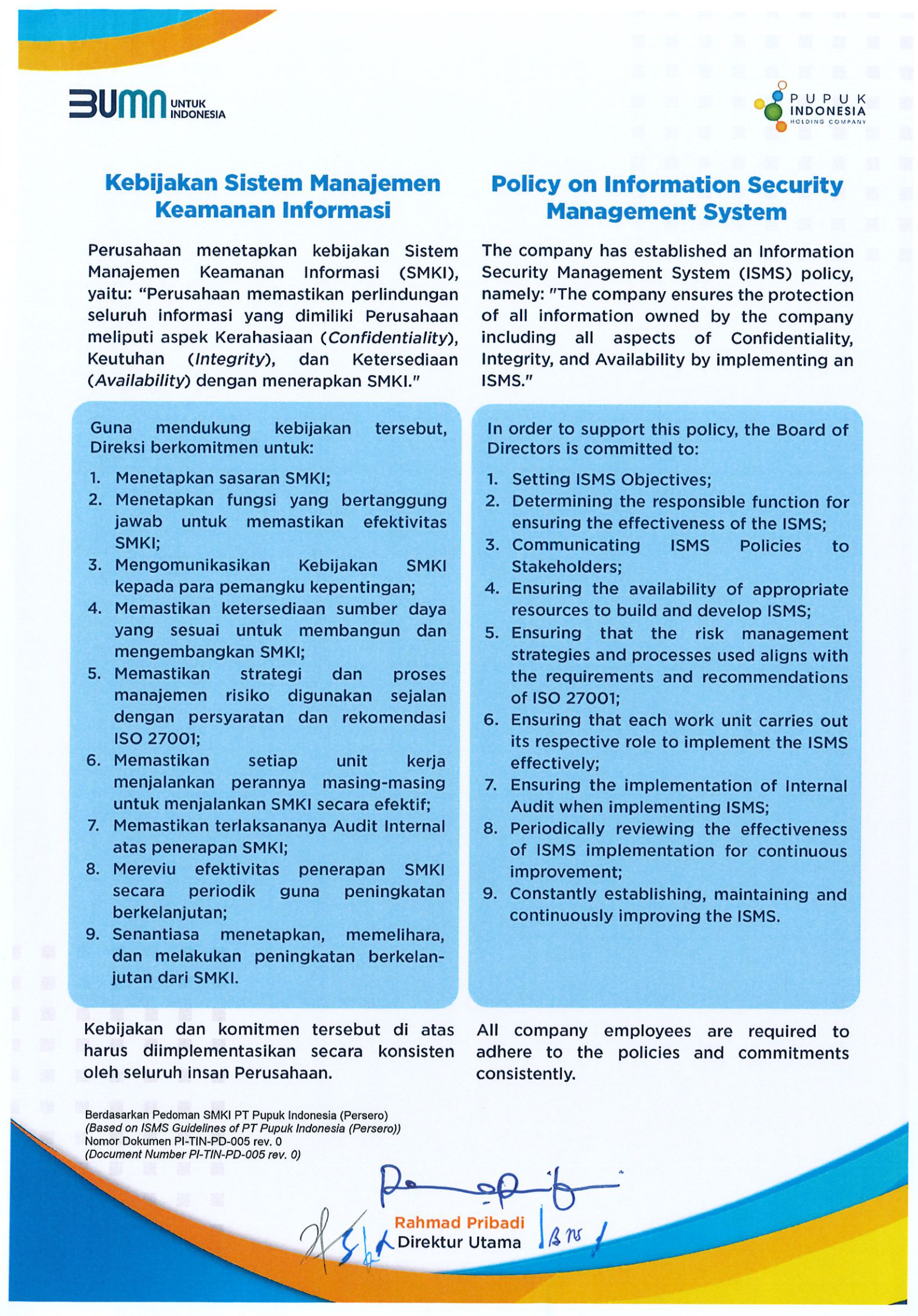 Perusahaan juga menyelenggarakan kegiatan sosialisasi bertema “Strategi Keamanan Siber pada Era Industri 4.0 di PT Pupuk Iskandar Muda” pada tanggal 25 September 2024 kepada seluruh karyawan, Kegiatan ini menghadirkan narasumber dari Badan Siber dan Sandi Negara (BSSN) yang memberikan pemaparan terkait strategi dan penerapan keamanan siber di era digital serta pentingnya peran karyawan dalam menjaga keamanan data dan sistem informasi perusahaan.